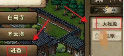 完成山崖的探索后,返回城镇或相关区域,找到“大雄殿”。在大雄殿内,进行“进香”仪式。
