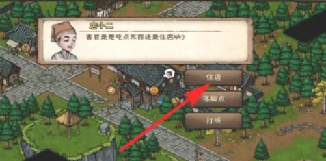 走近店小二后,点击与其对话的选项。在对话窗口中,会出现多个选项,包括“住店”、“吃饭”等。