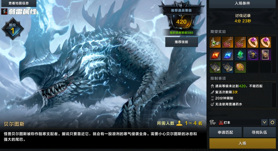 贝尔图斯是冰属性怪物,所属地图为【酷寒避难所】,其弱点是雷属性,使用雷属性技能可以额外造成10%的伤害。