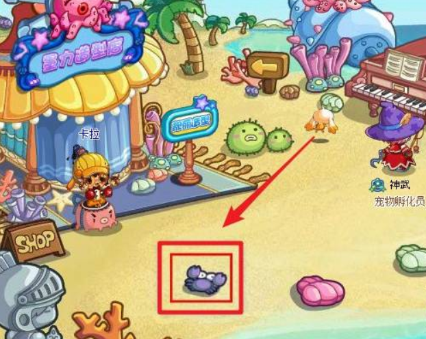 2、到达区域以后,一直点击螃蟹。直到螃蟹从沙滩中挖出水灵石为止。