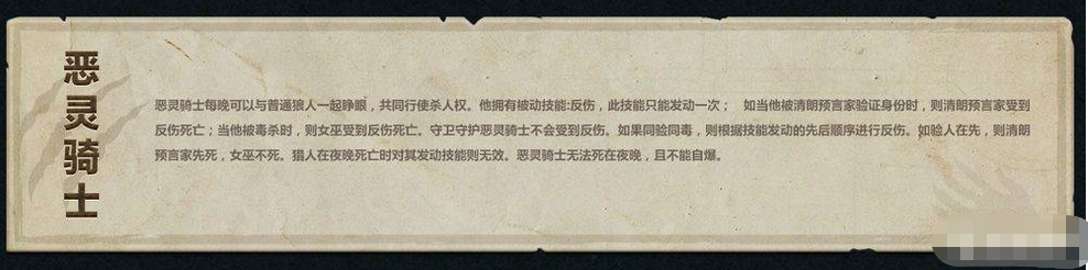 反伤技能:当恶灵骑士被预言家验证身份时,则预言家受到反伤死亡;当恶灵骑士被毒杀时,则女巫受到反伤死亡;当守卫守护恶灵骑士时,不会受到反伤。如果同验同毒恶灵骑士,则根据技能发动的先后顺序进行反伤。如验人在先,则预言家反伤死亡,女巫不死,反之,女巫死亡。猎人在夜晚死亡时对其发动技能则无效。守卫也无法守护恶灵骑士的反伤对象。