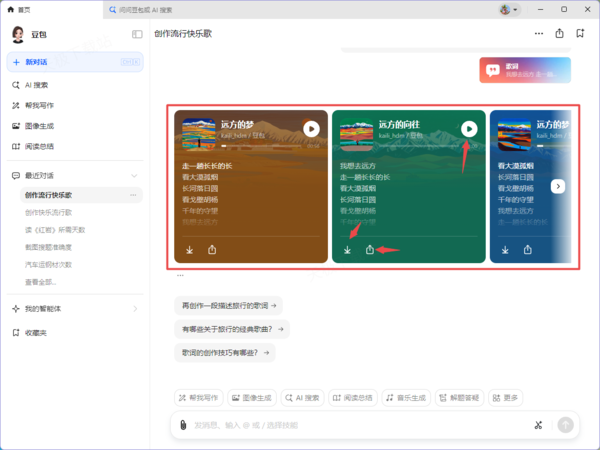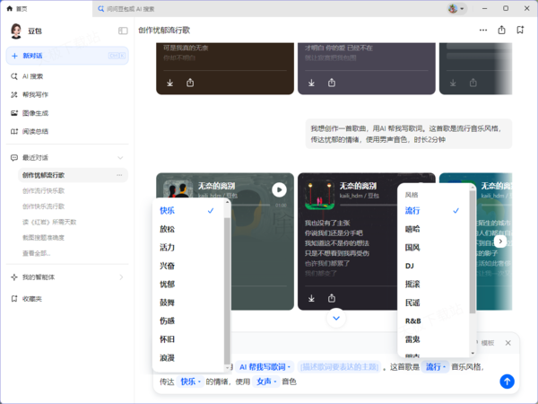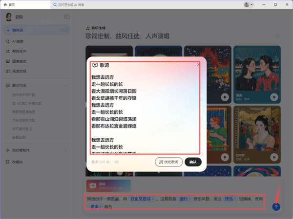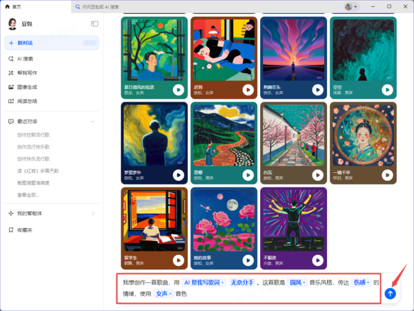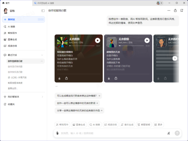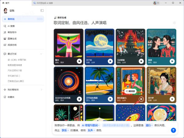 通过小编亲自使用发现,豆包ai电脑版可以写歌,这要得益于软件的【音乐生成】功能,它不仅可以帮大家制作歌曲,还可以智能生成歌词,当然了,如果大家有自己写好的歌词,也可以使用它来进行歌曲的制作,轻松把自己的想象力变成好听的音乐。详细的歌曲生成教程如下。