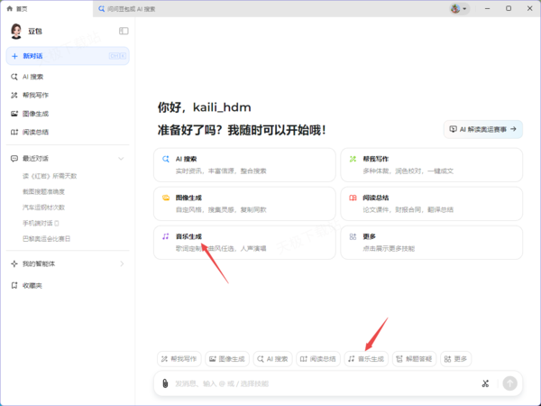 1、启动软件,找到右侧界面中的【音乐生成】功能,或者是点击底部输入框上方的【音乐生成】功能。