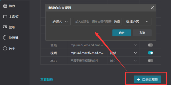 第二,进入软件的设置中心,找到“桌面整理”这个窗口,然后选择右下方的“自定义规则,选择规则类型为“关键字”,选择好这个规则以后再输入关键字的“项目”,选择需要整理到的分区位置,点击确定就创建好了自定义的规则。如果有多个关键词的时候,要使用中文或者英文逗号来区分开,创建“素材”的自定义规则方法和“项目”是一样的。