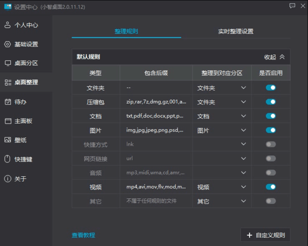 小智桌面的默认规则就是平台规定好的九种规则,用户要根据自己的需要来选择是否启用,如果开启了默认规则,使用小智桌面工作时,符合平台规则的文件就会被放到同一个分区里,不符合规则的文件就不会被放置到里面,对于电脑桌面上文件较少的伙伴可以按照软件的默认规则来整理桌面。