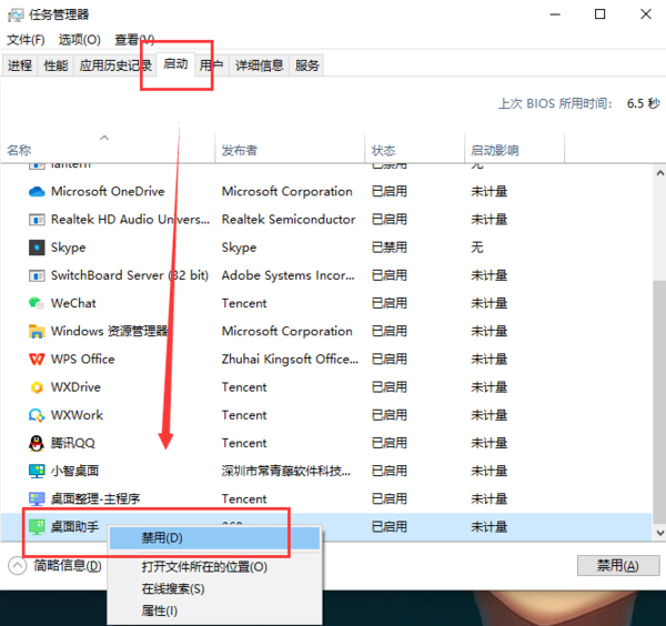 这次问题解决了,如果想在下次开机时不再出现软件冲突的情况,也可以在任务管理器窗口的“启动”标签栏中找到360桌面助手,鼠标右键,点击“禁用”功能,就可以关闭掉360桌面助手的开机自动启动,这样在下次开机时就只会启动小智桌面这一款软件了。
