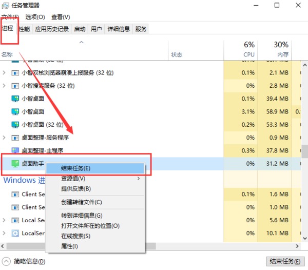 返回到电脑桌面上,使用键盘的Ctrl+Shift+Esc快捷键打开电脑设备的任务管理器,在“进程”这一标签栏中找到同类型软件360桌面助手,单击鼠标右键,在弹出的菜单栏中点击“结束任务”,把360桌面助手停止运行以后,桌面也就不再闪烁了。