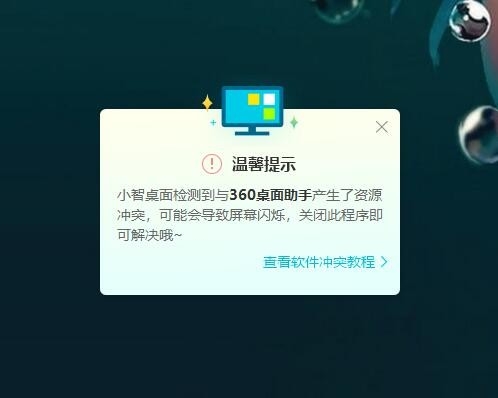 如果你的电脑上同时安装了小智桌面和其他的壁纸软件,比如元气桌面,360桌面助手,腾讯桌面,当我们开机以后,这些软件同时启动的时候,屏幕就会出现闪烁的问题,同时小智桌面的页面也会弹出关于软件冲突的提示,如下图所示。那么该如何正确解决这种问题怎样才能避免小智桌面一直闪烁呢,我们接着往下看吧。