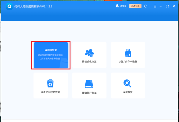第一步,在电脑上启动转转大师数据恢复软件,在工具的主界面如下图红框所圈住的那样,点击“误删除恢复”选项。