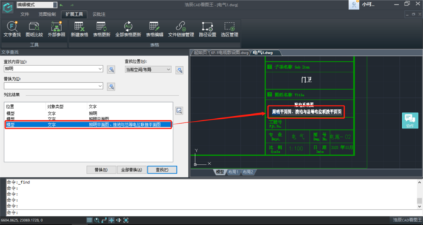 3,当我们想要查找的相应文字内容出现以后,我们要在列表结果中双击鼠标左键,就能够锁定这个文字在图纸中的具体位置了,更好的方便我们进行查阅。