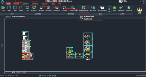 首先在电脑上打开浩辰CAD看图王工具,将需要批量进行图纸分割的CAD图纸文件打开,然后在“文件”菜单栏中找到“批量图纸分割”这个工具。