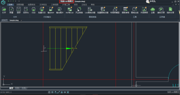 第一步,我们可以在财神爷站网安装浩辰CAD看图王电脑版,登陆以后把需要测量角度的CAD图纸打开,如下图界面展示,我们可以看到这个楼梯的侧面是一个斜面图形,之前我们遇到这种斜面,因为没有准确的实体线条而没有办法准确的测量出角度值。