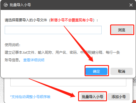 如果不想一个个编辑,也可以提前准备好文件,进行批量导入。同样是在游戏管理窗口,点击页面下方的“批量导入小号”键,浏览找到文件后,点击确定,软件就会自动识别导入了。