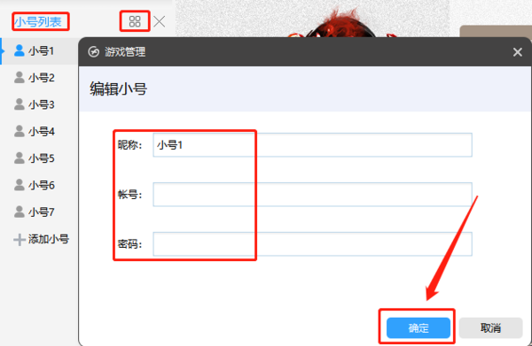 点击小号列表右侧的管理小号图标,在弹出的游戏管理窗口,点击小号名称右侧的编辑图标,就能编辑更改该小号的名称,以及登录游戏的账号和密码。编辑完之后,点击确定,下次再打开是就能用编辑的账号登录游戏了。