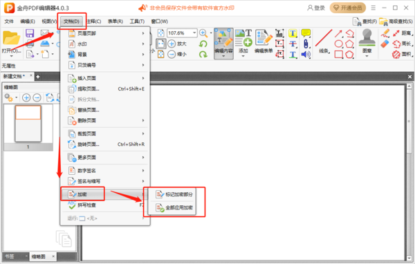 是可以的,我们打开金舟PDF编辑器之后,在上方点击“文档”,接着在下方那个出现的选项中找到“加密”,之后右侧会出现两个选项,我们在这里选择是需要对区域进行加密处理,还是对整个文档进行加密就可以了。