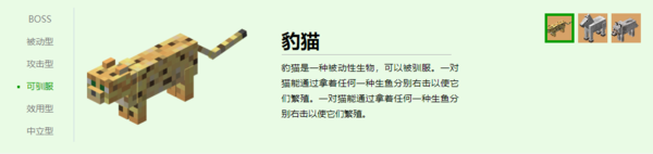 我的世界中,除了攻击型、被动型以及中立型的动物之外,还有一些可驯服和驯养的动物。主要有:豹猫,马,羊以及海龟等生物。