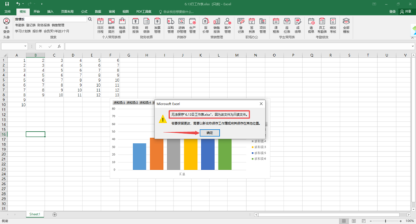 4、然后我们双击打开这个表格,然后在表格中做一些修改,然后点击【保存】按钮,或者是按下键盘上的【Ctrl+S】保存快捷键来修改文档的保存。此时,我们会看到软件会弹出一个提示,提示【无法保存,因为该文件为只读文件。若要保留更改,需要以新名称保存工作簿或将其保存在其他位置】的提示信息,此时我们点击【确定】按钮。