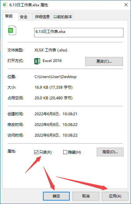 3、此时,我们勾选【只读】选项,然后点击【应用】按钮,再点击【确定】按钮。