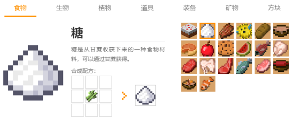 1、可用甘蔗合成糖,一根甘蔗放置于工作台可获得一份糖,而糖在游戏中也是相当重要的合成资源之一;