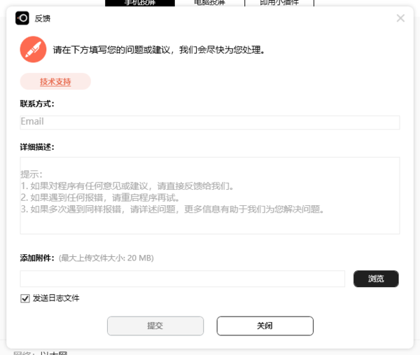 之后会弹出问题反馈的窗口,在这里可以填写自己遇到的问题,也可以上传一些附件来辅助说明问题,并留下自己的联系方式。都填写完成后,点击下方的“提交”,就可以把问题反馈给官方,耐心等待回复就可以了。