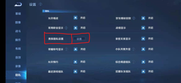第三步,进入隐私设置后找到【贵族隐私设置】并点击该选项右侧的【设置】;