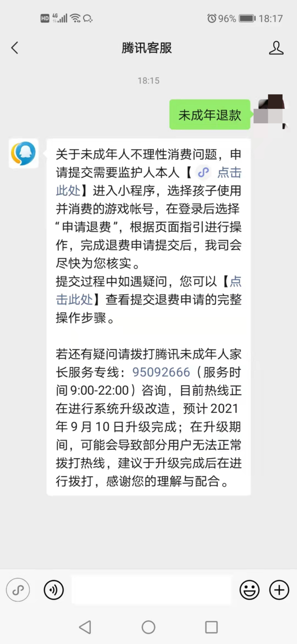 2、在对话框输入【未成年退款】并发送消息,客服会弹出进入申请退费小程序的链接;