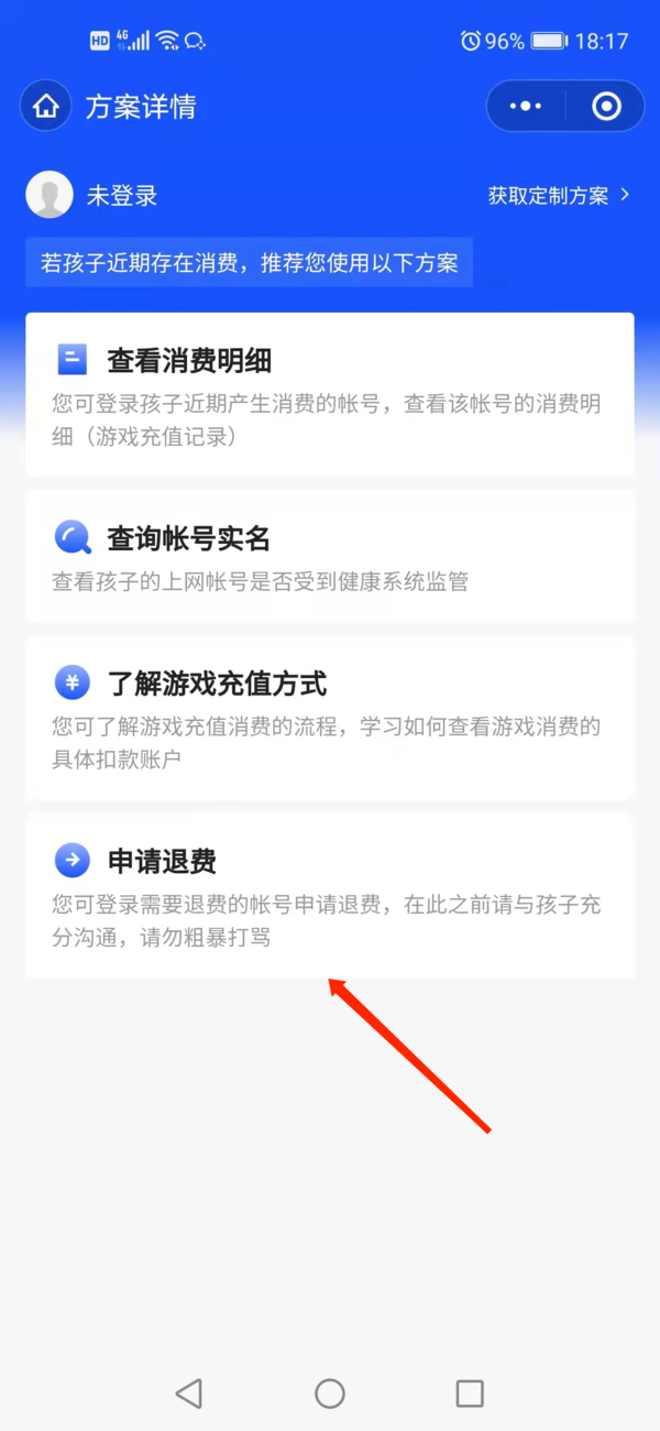 5、监护人可先查看消费明细,与孩子沟通核实后可发起【申请退费】;