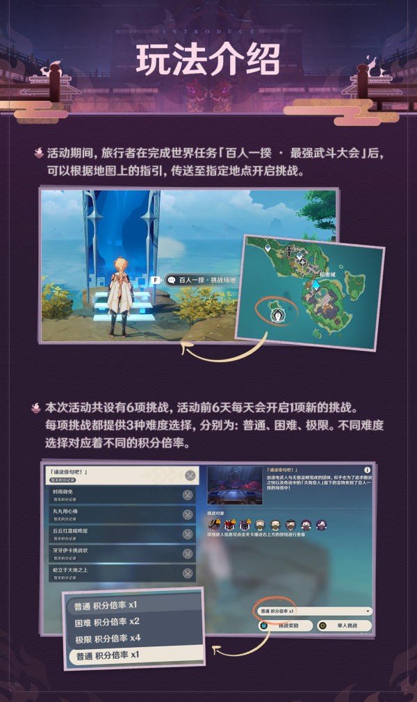 在9月2日至9月13日活动期间,旅行者在完成世界任务「百人一揆·最强武斗大会」后,可以根据地图上的指引,传送至指定地点开启挑战。