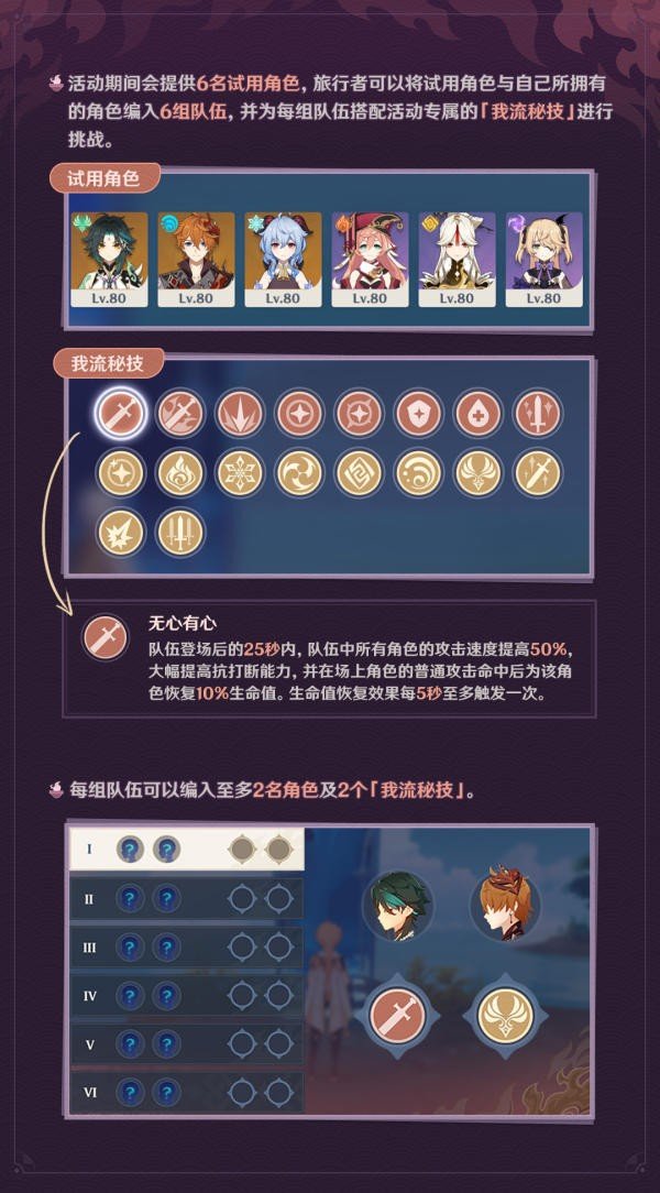 活动期间会提供6名试用角色,旅行者可以将试用角色与自己所拥有的角色编入6组队伍,并为每组队伍搭配活动专属的「我流秘技」进行挑战。