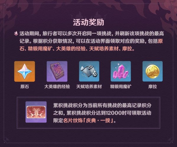 在活动期间,旅行者可以多次开启同一项挑战,并刷新该项挑战的最高记录。根据积分获取情况,可以在活动界面领取对应的奖励。
