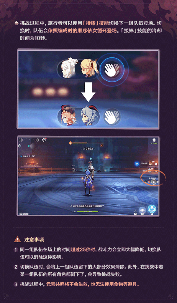挑战过程中,旅行者可以使用「接棒」技能切换下一组队伍登场。切换时,队伍会依照编成时的顺序依次循环登场。「接棒」技能的冷却时间为10秒。
