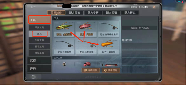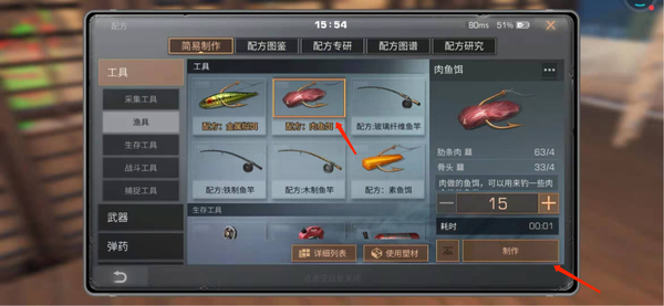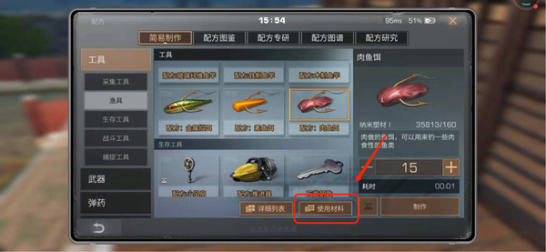 3、材料准备好后点开左侧【配方】,在工具栏的渔具处可以看到三种鱼饵;