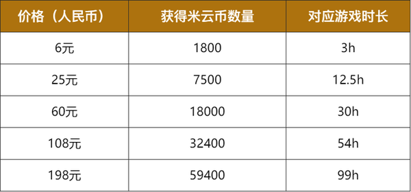 【米云币】:用于抵扣《云·原神》游玩时长,可通过购买获得。购买后可在信息界面及用户中心查看当前账户中米云币的余额。米云币有以下5个充值档位: