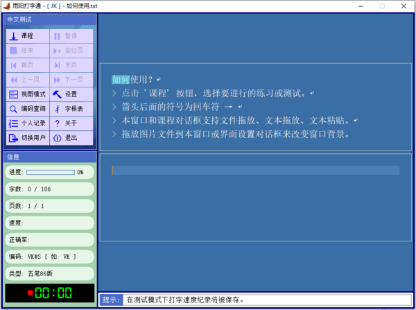 纠正指法是打好基础的关键,雨阳打字通中有很多的精选文章,我们可以在软件中用这些文章来练习我们的打字手法,并逐渐提升速度和准确性,在这里可以记录我们每一次的练习的情况,以便我们查阅。