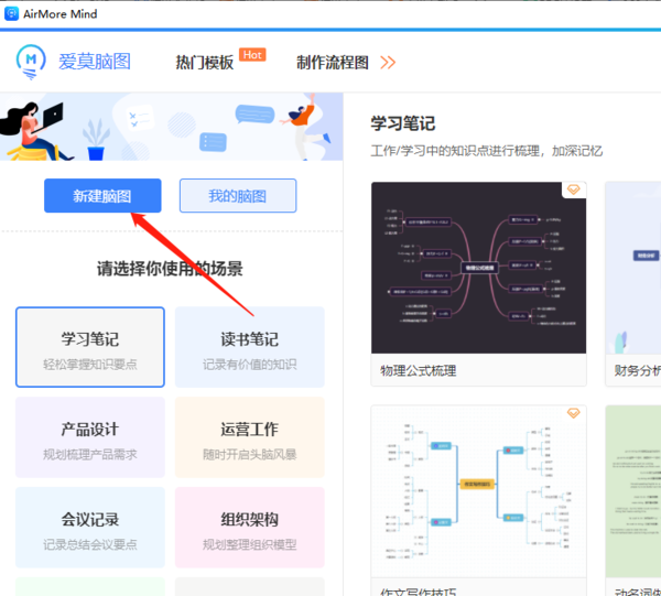 在爱莫脑图软件中,制作思维导图非常关键的一步那就是使用关系线,也是能形成思维导图的步骤之一,首先打开电脑中的爱莫脑图软件,进入后,点击左上方的新建脑图,