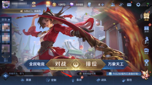 1.?首先进入到王者荣耀的主界面后,点击底部的备战。