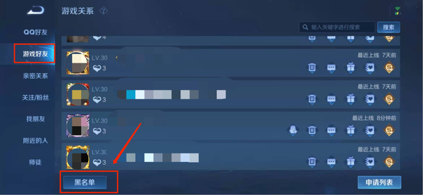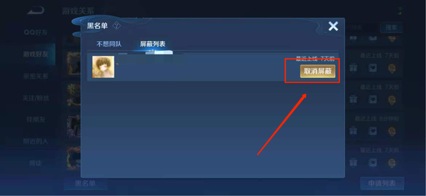 上述步骤完成后,该好友就被我们拉进了黑名单,如果想要解除对好友的屏蔽我们只需要再次打开好友系统将页面转移到游戏好友栏中,打开下方的黑名单/屏蔽列表,将该好友取消屏蔽就可以了。