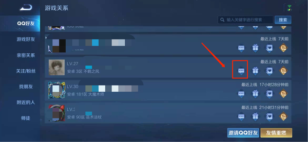 第二步,进入游戏关系页面后选择想要加入黑名单的好友,点击旁边的聊天图标进入好友聊天界面;