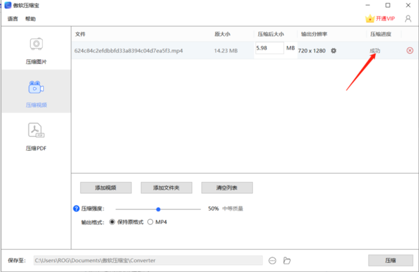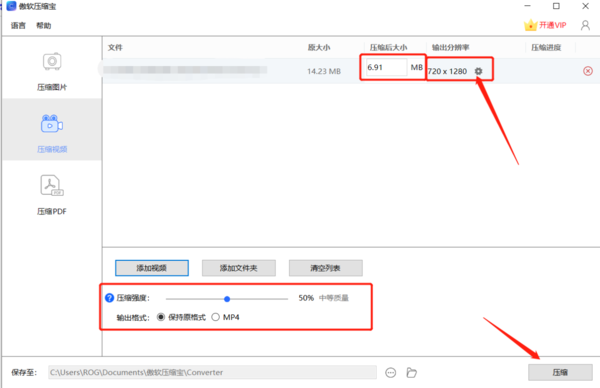 第五步,界面下方选择压缩强度及输出格式,压缩强度百分比越大,文件将会越小。