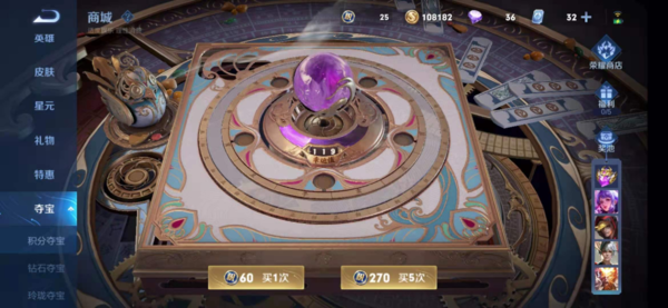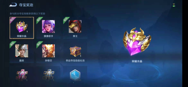 在游戏设计出的各种品质的皮肤中,通过积分夺宝才能获取的荣耀典藏皮肤更是深受很多人的喜爱。一般来说积分夺宝中的幸运值满必定可以获得荣耀水晶,也有欧皇没有等到满幸运值就抽到了荣耀水晶,当然概率比较小。
