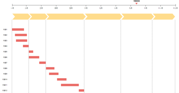甘特图则是让我们更好地明确在什么时间上,完成什么事;Gitmind上的甘特图,也叫“时间轴图”,在甘特图上,以横轴表示时间(一般以一年为界),纵轴表示若干事件,这样我们就能组成时间-事件的图表;在企业管理中,我们可以用Gitmind上的甘特图,对企业一年的安排进行规划,让企业走在时间前面!