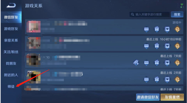 第三步:在游戏关系界面左边的第一栏选择最后一个师徒。