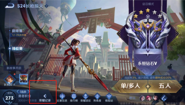 1.?在排位界面中,点击荣耀记录这个展开栏。