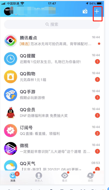 1.?登录上QQ后,点击右上角的+号。