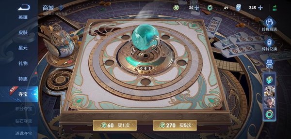 通过商城-夺宝进入玲珑夺宝界面,使用金币/铭文碎片/钻石购买播报,获赠玲珑积分。消耗玲珑积分进行夺宝,可以获得回城特效/击败特效/荣耀播报/头像框/个性动作等丰厚奖励。