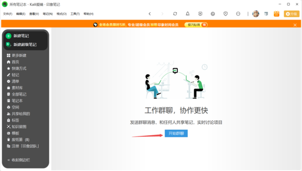 1、进入到PC版印象笔记软件的工作群聊窗口当中后,点击【开始群聊】按钮。