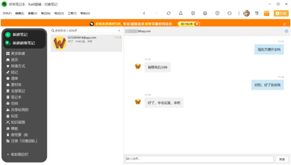 接着软件就会弹出工作群聊的聊天窗口了,这个就是印象笔记软件的工作群聊功能了。