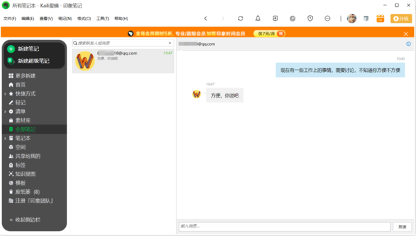 介绍完了PC版印象笔记软件中工作群聊功能的位置后,那么PC版印象笔记软件的工作群聊功能到底怎样使用呢?继续往下看吧。