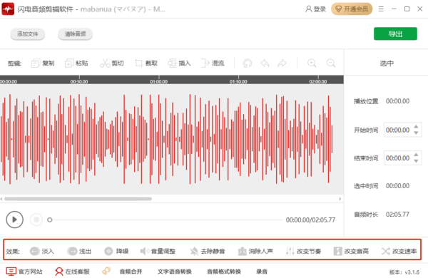 要说功能丰富度,那闪电音频剪辑软件和风云音频处理大师可谓是各有千秋;对于基本功能,类似剪切、合并、变速、降噪,这2款软件都可以轻松胜任;而两者也都有自己的“特异功能”,闪电音频剪辑软件可以进行音频变奏以及人声消除,而风云音频处理大师则有特殊的音频转换以及添加背景音乐。