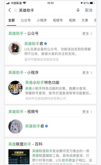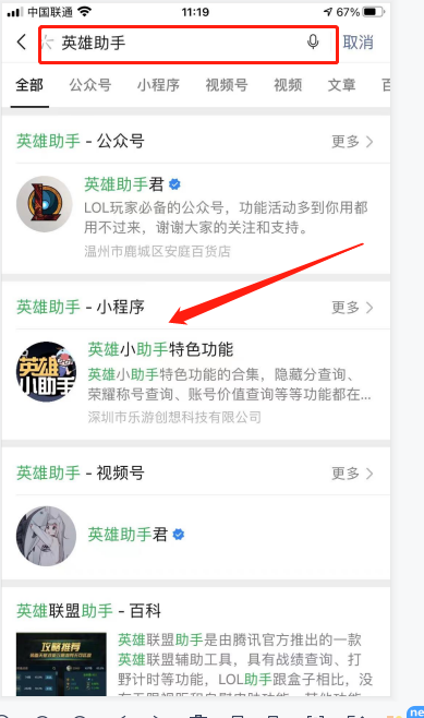 第二步:然后点击搜索的对话框,并在中输入英雄助手,搜索小程序。